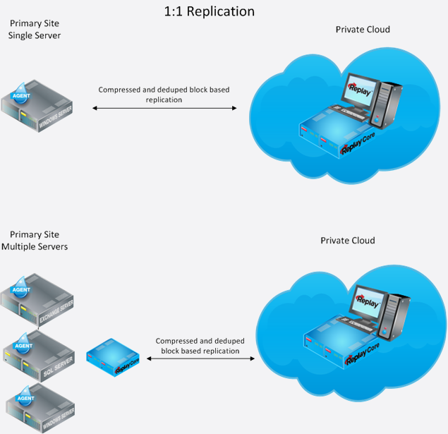 Replication replicates recovery points between the Replay cores and a private cloud in an efficient and safe manner enabling both off-site backup and off-site disaster recovery.