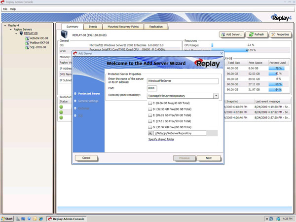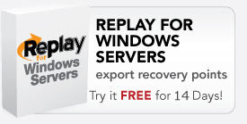 Replay for Windows Servers is an application-aware, server-based disk imaging solution that automatically and continuously images your entire Windows servers delivering accelerated application backups, fast local recoveries and advanced disaster recovery, all in one solution. Replay supports any Windows Server workload including Domain Control­lers, File servers, Print servers, and BlackBerry Enterprise servers to name just a few. Replay for Windows Server provides a centralized management console to manage all your protected servers from a single location. Replay is ideal for guest virtual machines and virtual hosts delivering accelerated application backup and recovery while reducing the load on production VMware ESX, VMware Server and Microsoft Hyper-V hosts.