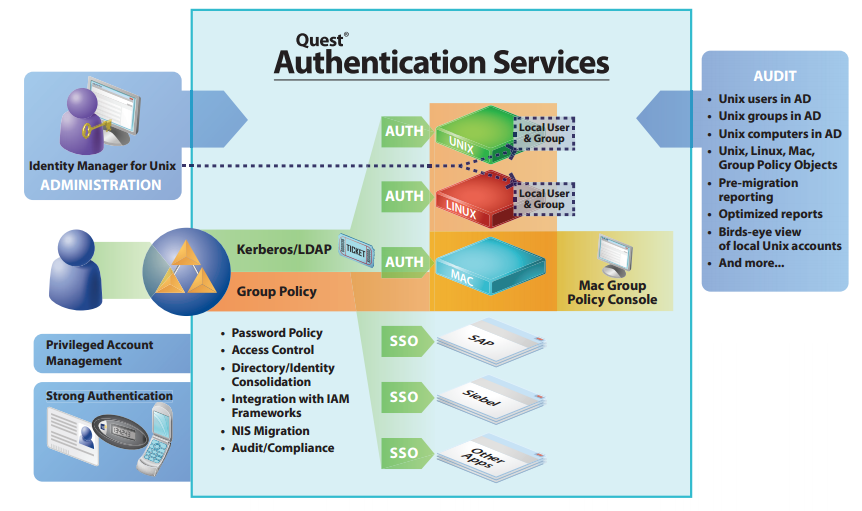 Quest Authentication Services is patented technology that addresses the authentication needs of more than 1,000 enterprise customers with more than 5 million installed seats by extending the security and compliance of Active Directory to Unix, Linux and Mac, as well as to many enterprise applications. Some of the largest and most complex global environments rely on Authentication Services to achieve compliance with cross-platform access control, improve operational efficiency with centralized authentication and single sign-on, as well as unify identities and consolidate directories for simplified identity and access management