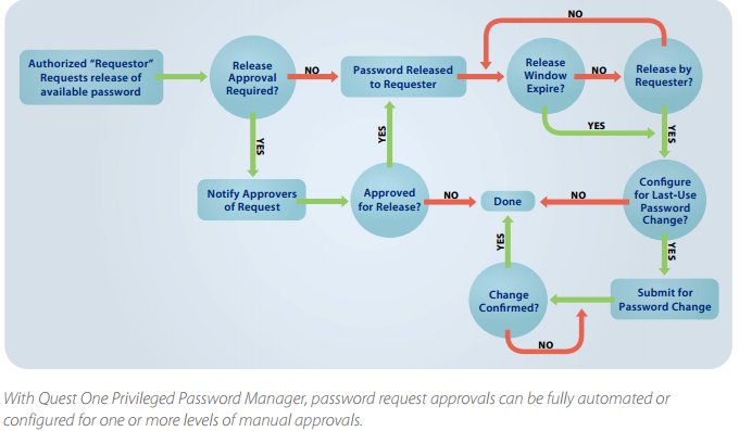 Quest One Privileged Password Manager automates, controls and secures the entire process of granting administrators the credentials necessary to perform their duties. Privileged Password Manager ensures that when administrators require elevated access, that access is granted according to established policy, with appropriate approvals, that all actions are fully audited and tracked and that the password is changed immediately upon its return.