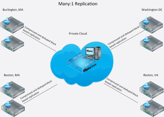 The Many : 1 configuration is useful for protection of remote offices from a centralized location; multiple replication sources can replicate to one replication target as shown in the figure below.