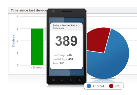 Alerts and reports monitor gaps between check-in times, policy compliance issues, and device permissions for a total mobile GRC solution