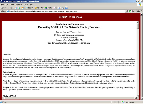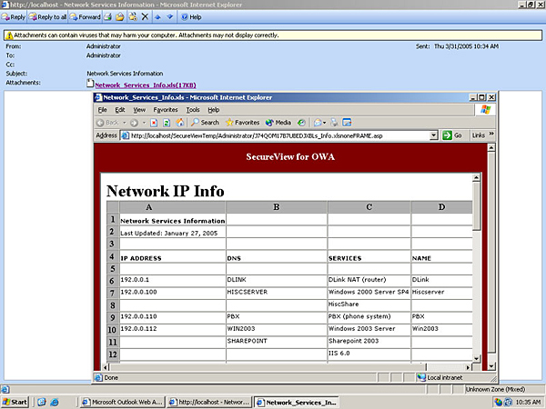 SecureView for OWA maintains all original file formatting and graphics when using standard view. Or view using Text-only which is maintains basic formatting and is perfect for PDAs and slower web connections. It also supports all browser types including Explorer, FireFox, etc. There is no need for ActiveX or Java client.